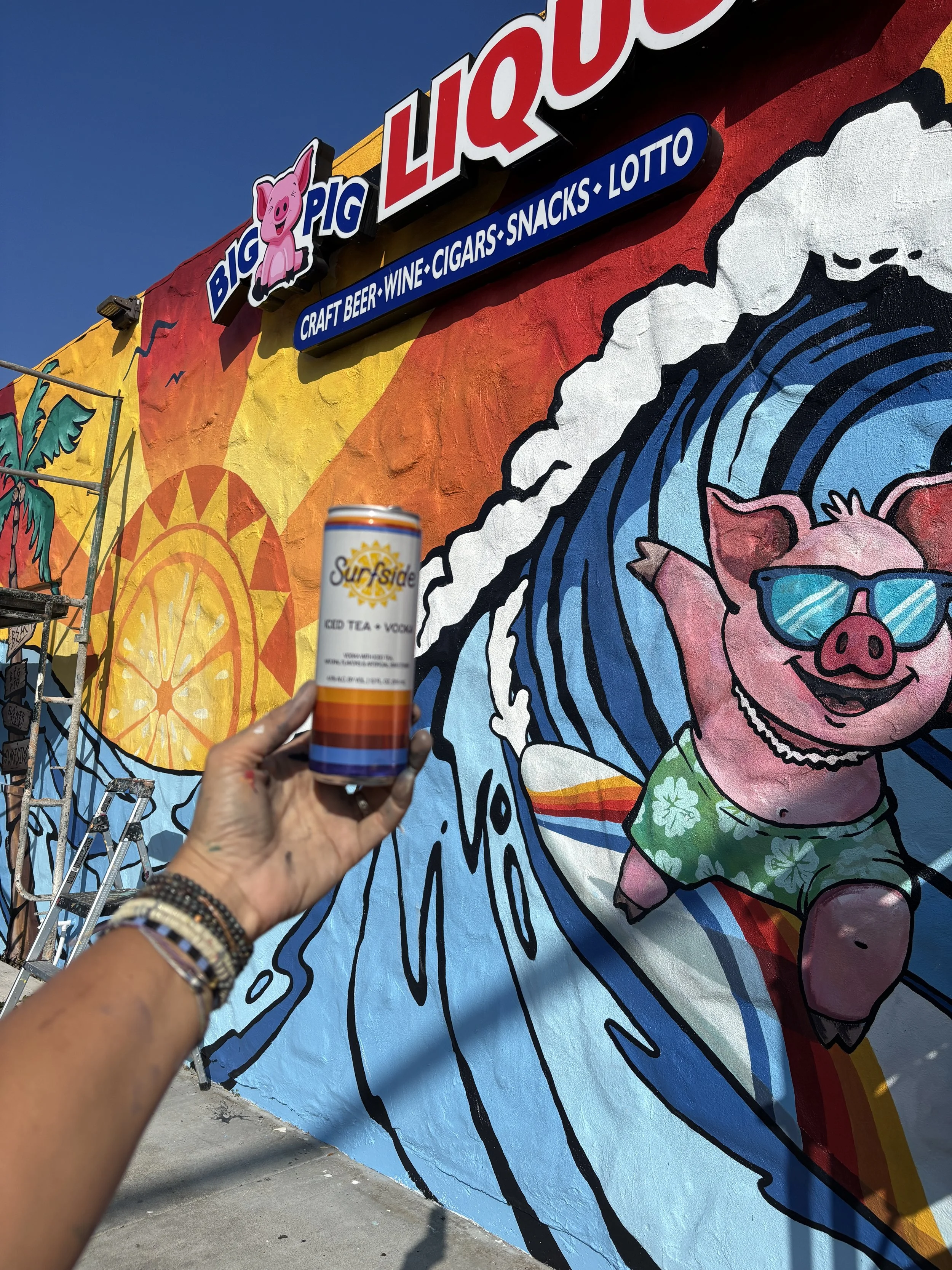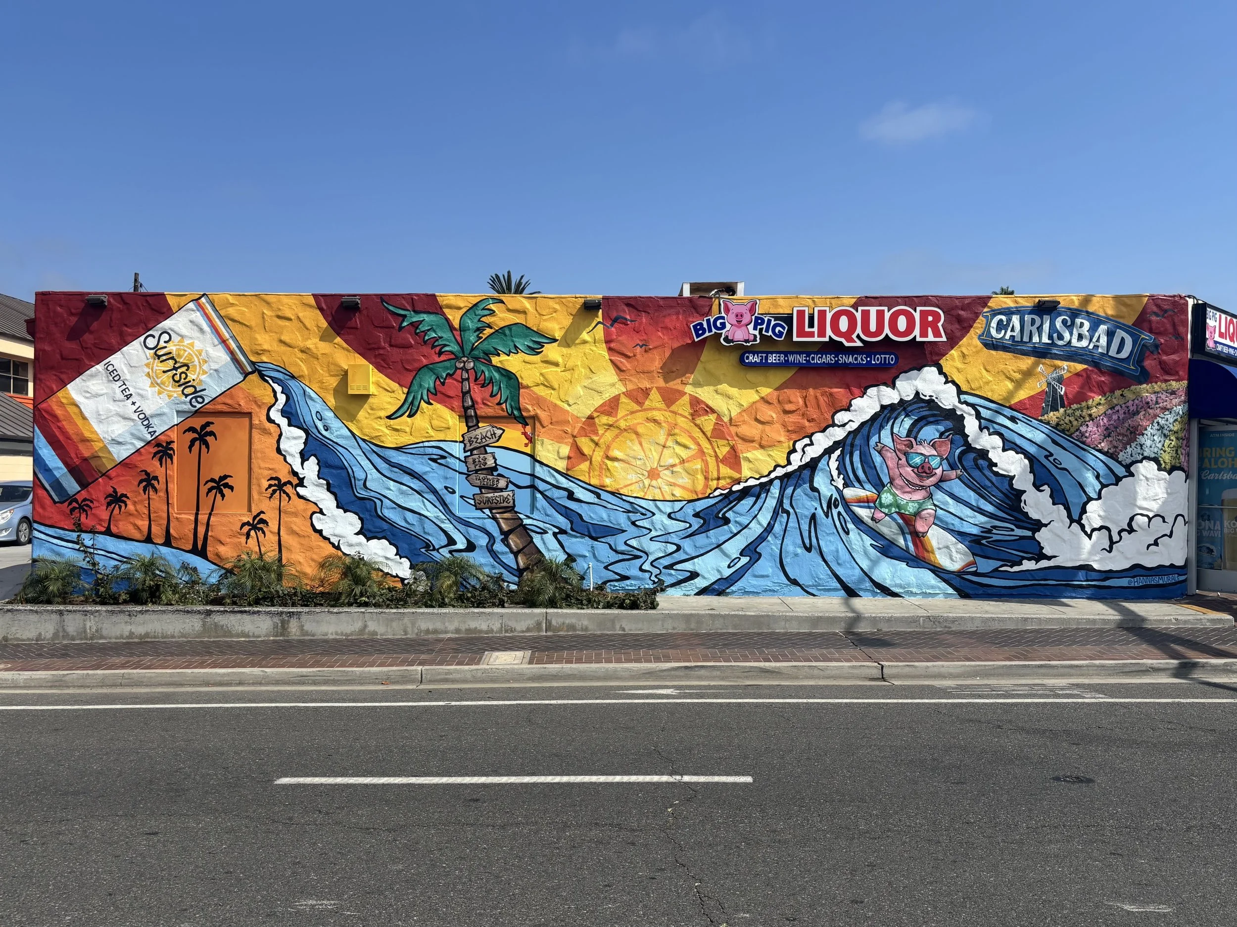 the side of Big Pig Liquor in Carlsbad, CA. The bold mural features the Surfside color palette